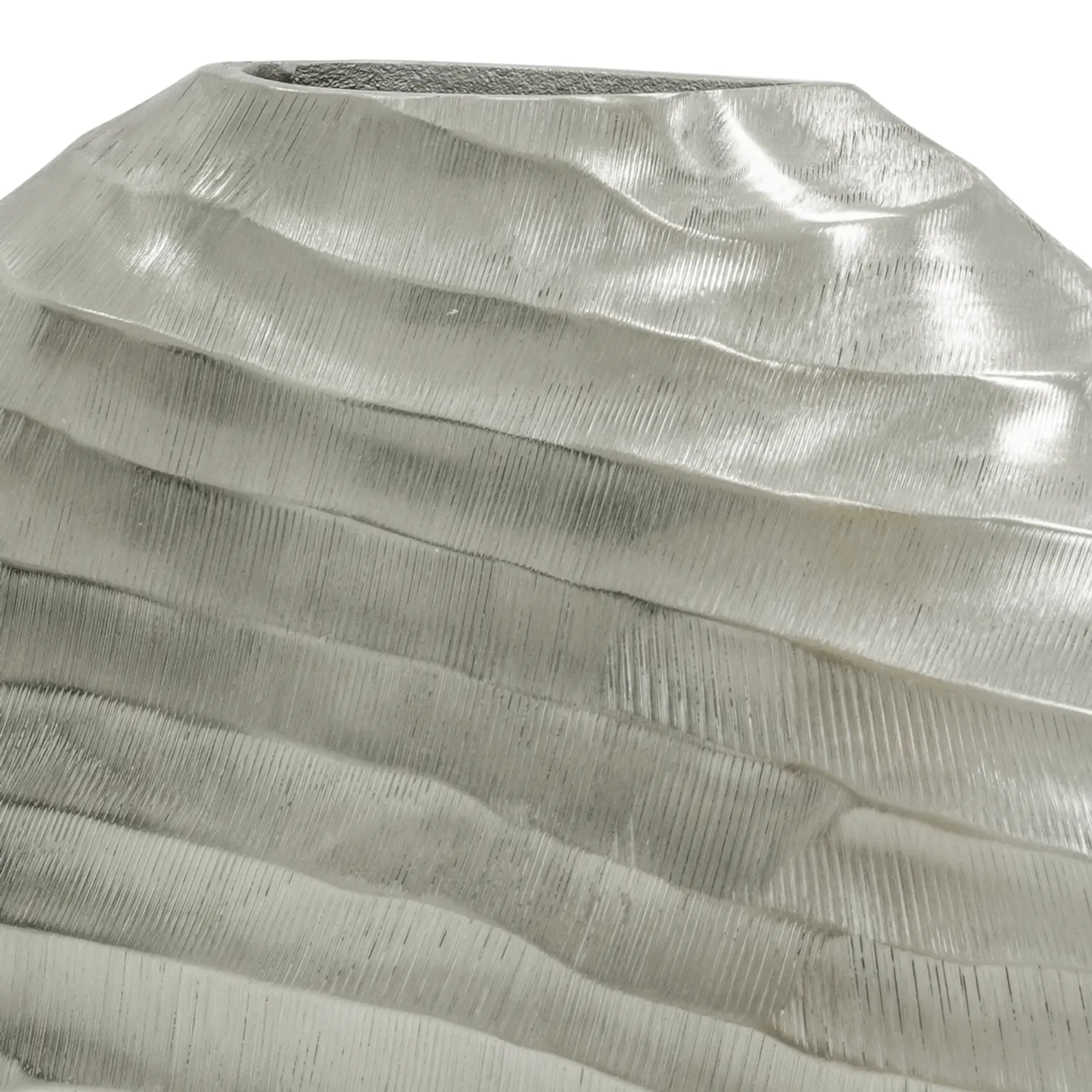 Chased Oval Vase, a wide yet narrow oval vase that reflects its surroundings thanks to its antique nickel finish. Crafted of chiselled aluminium, this decorative item features a striking design that recalls the originality of simple linework.